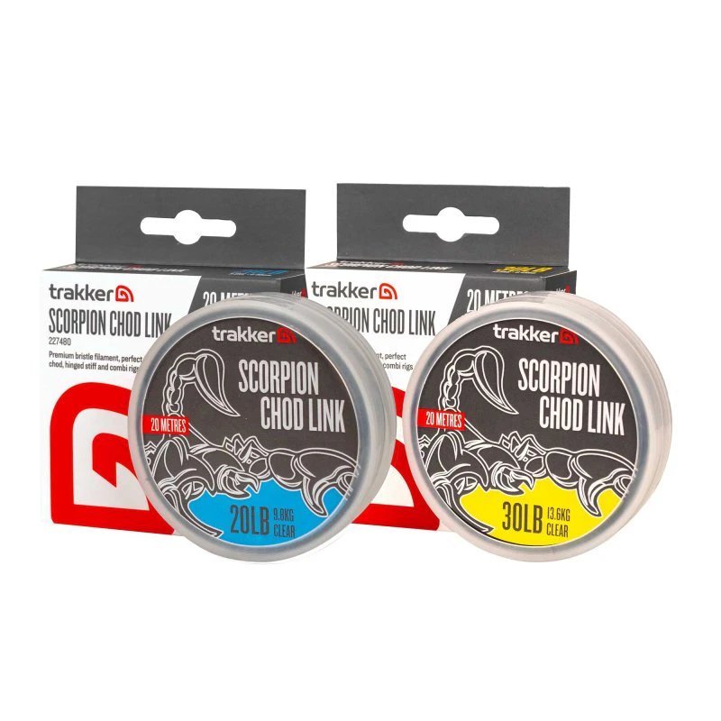 Scorpion Chod Link je perfektní tuhý materiál pro jakékoli návazce vyžadující zakřivenou, koncovou část – ideální volba pro chodové návazce nebo combi rigy. Vlascový materiál skvěle drží požadovaný tvar a snadno se s ním pracuje i bez nutnosti napařování. Nízký průměr a vysoká tuhost Scorpion Linku je ideální i pro tvorbu D-Rigů ve stylu bezuzlového vázání. Materiál se také dokonale hodí pro výrobu tuhých částí Combi rigů, nebo plovoucích návazců, pokud chytáte s helikoptérou. Scorpion Chod Link je k dispozici v 20 a 30 lb. Povrchová úprava je v matně čirém provedení s nízkou viditelností, takže je téměř neviditelná na všech typech dna. Vlastnosti produktu ideální pro chod, stiff nebo combi rigy skvěle drží požadovaný tvar dokonale se hodí pro výrobu tuhých, rovných částí Combi rigů je ideální i pro tvorbu D-Rigů ve stylu bezuzlového vázání ultra pevný a extrémně odolný proti oděru vysoká pevnost v uzlu a celková spolehlivost vyrobeno v Německu Technické parametry Nosnost: 9,8 kg (20 lb) nebo 13,6 kg (30 lb) Průměr: 0,40 mm nebo 0,45 mm (dle zvolené varianty) Barva: matně čirá s nízkou viditelností Délka: 20 m