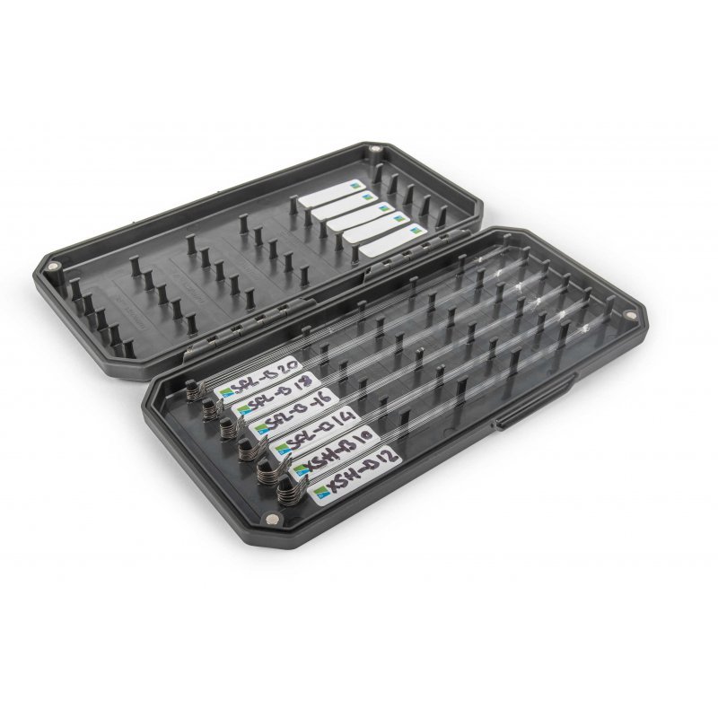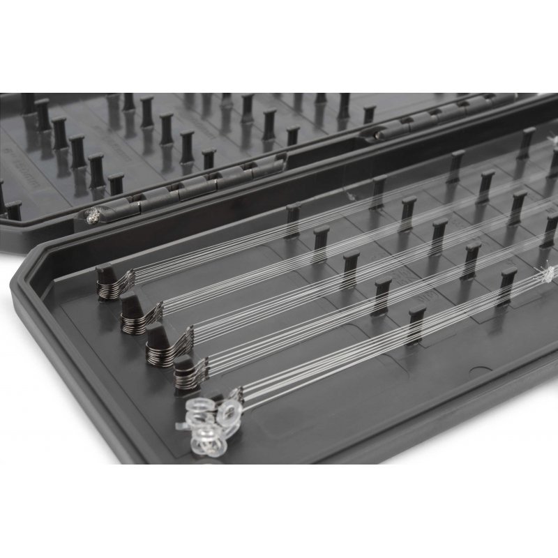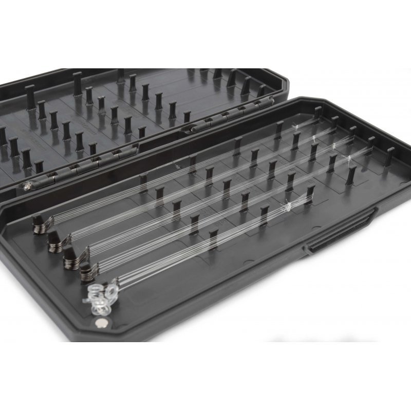 Tento zásobník na návazce je navržený pro umístění návazců v rozmezí od 4” (10 cm) – 12” (30 cm), se může pochlubit velkým úložným prostorem při zachování kompaktního profilu. Zásobníky na návazce Absolute jsou vyrobeny ze silného vyztuženého materiálu, který je uzavřen pomocí magnetů a poskytuje voděodolné těsnění. Velká množství vnitřních kolíčků umožňuje použití tohoto boxu pro návazce na děličku, match i feeder, ideální všestranný zásobník na návazce.