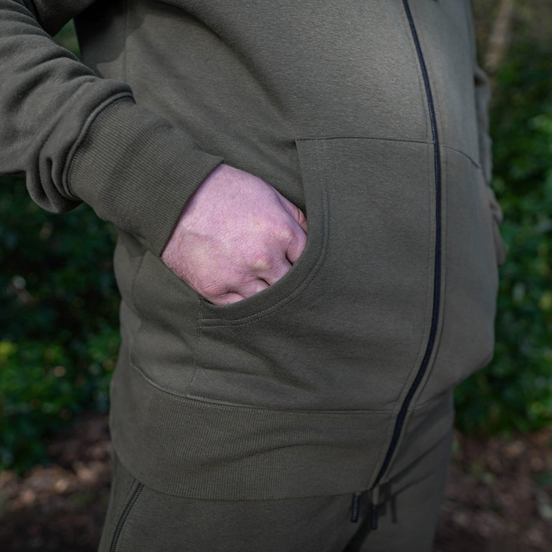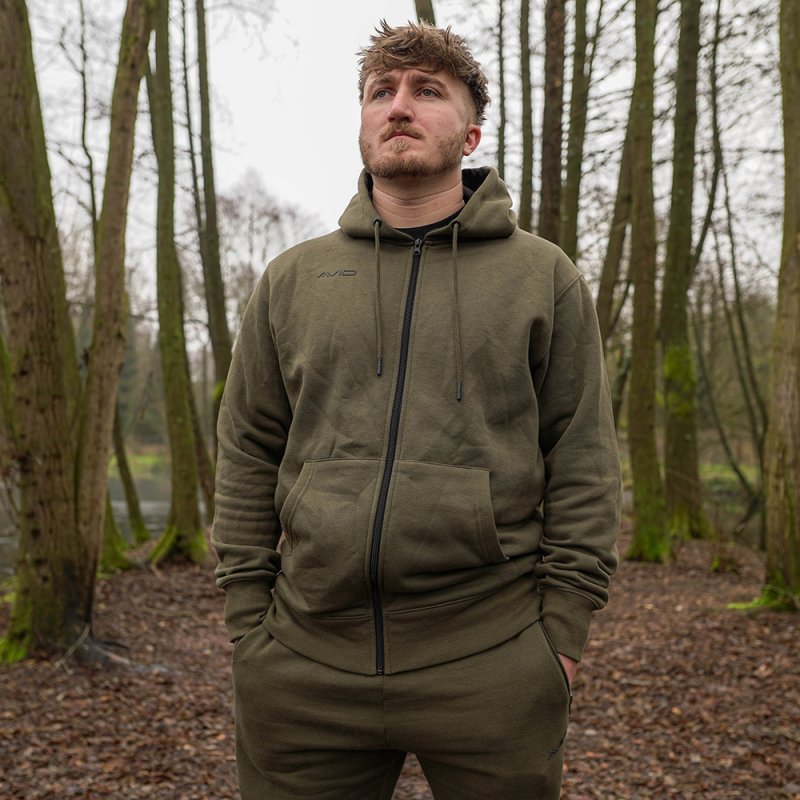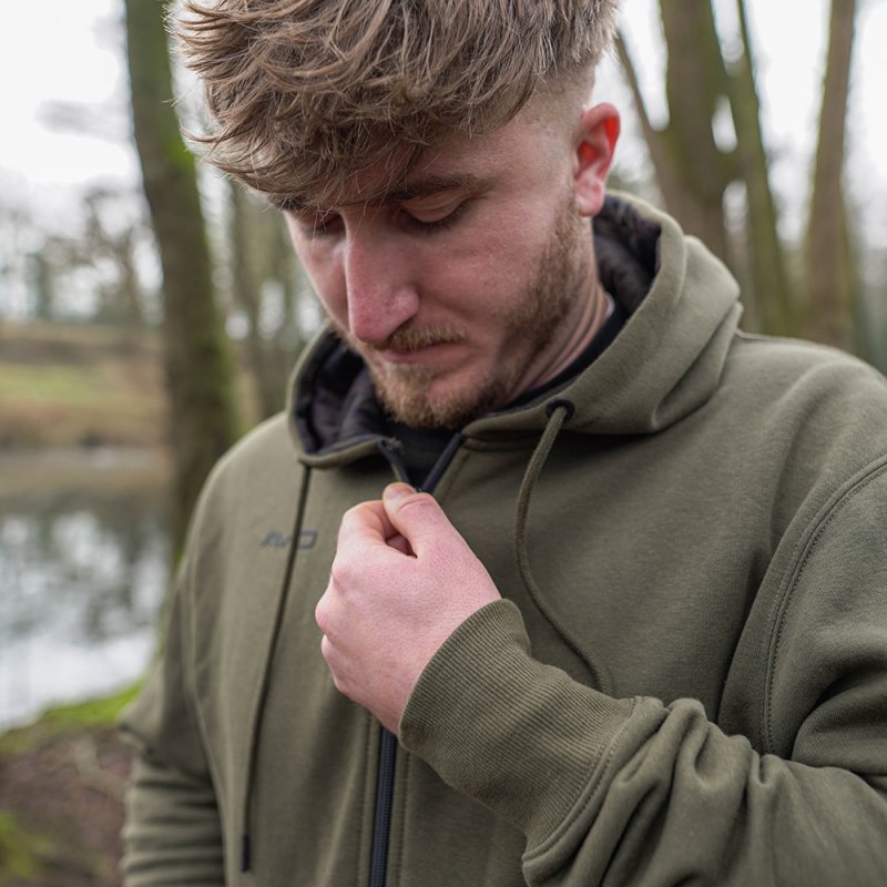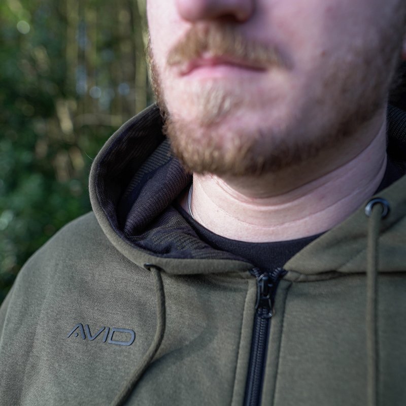 khaki mikina, která má na vnitřní straně náš unikátní potisk Avid Carp Distortion Camo.