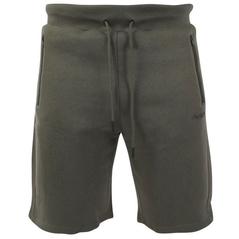 Stylové teplákové kraťasy v khaki barvě s nápisem Avid Carp na přední straně a logem na zadní kapse.