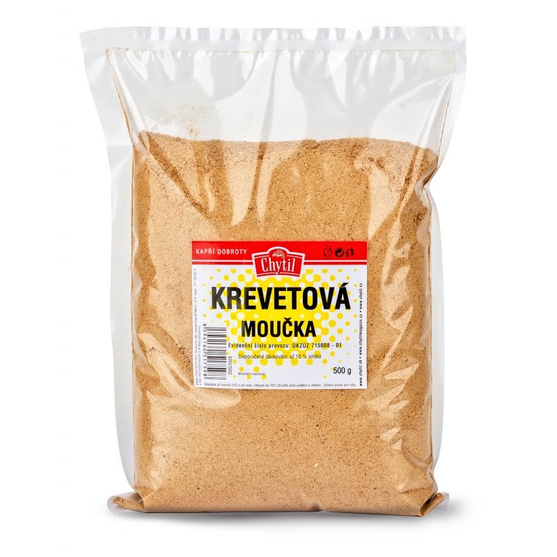 Krevetová moučka se vyrábí z malých krevet, tzv.garnátů. Extruzí moučky (tepelným procesem) dochází k zlepšení její pojivosti ve směsi, moučka je lépe stravitelná a vyniknou více její chuťové vlastnosti. Krevetová moučka má asi nejvýraznější rybí aroma ze všech rybích mouček! Je silné a specifické, má vůni po "mořské soli s rybinou".